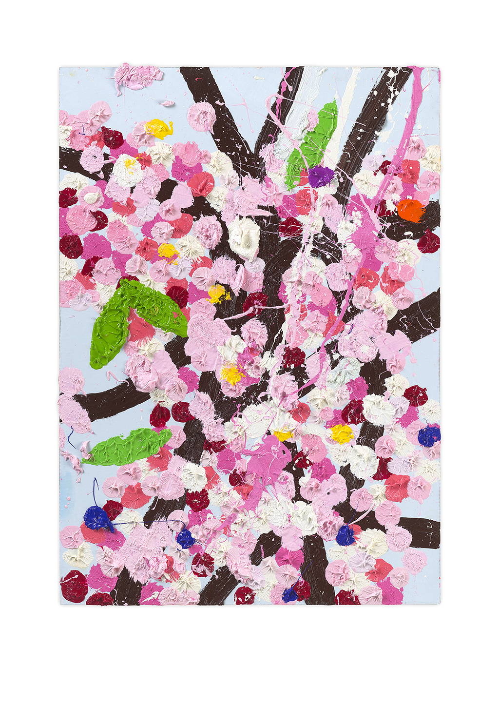 Paper Blossoms is a series of 900 unique original paintings on card featuring the vibrant imagery of Hirst's Cherry Blossoms paintings.