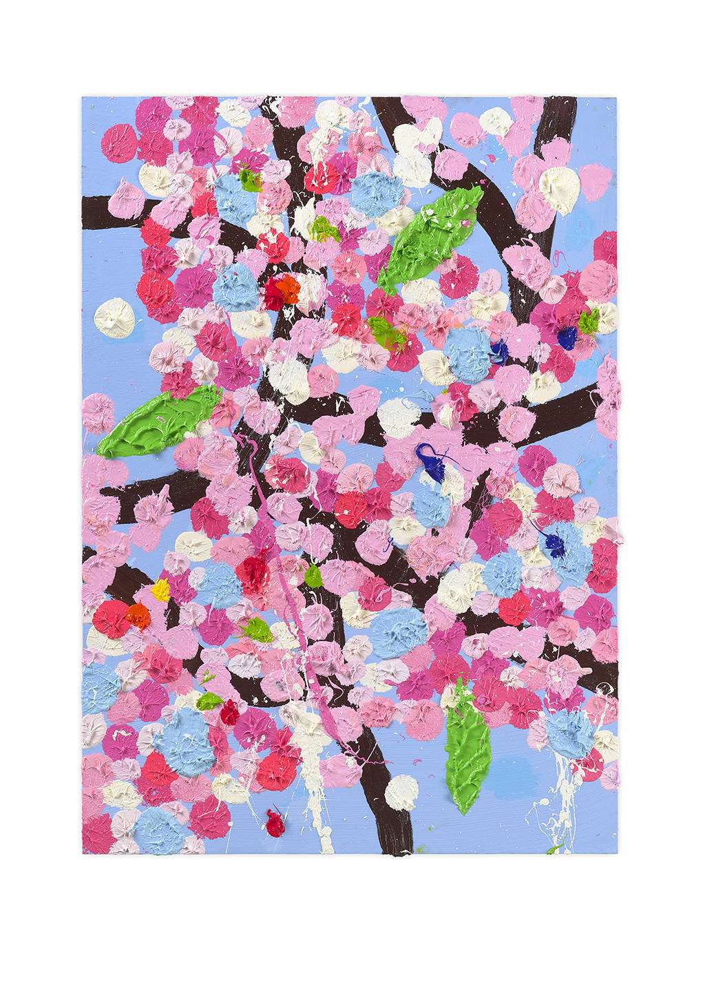 Paper Blossoms is a series of 900 unique original paintings on card featuring the vibrant imagery of Hirst's Cherry Blossoms paintings.