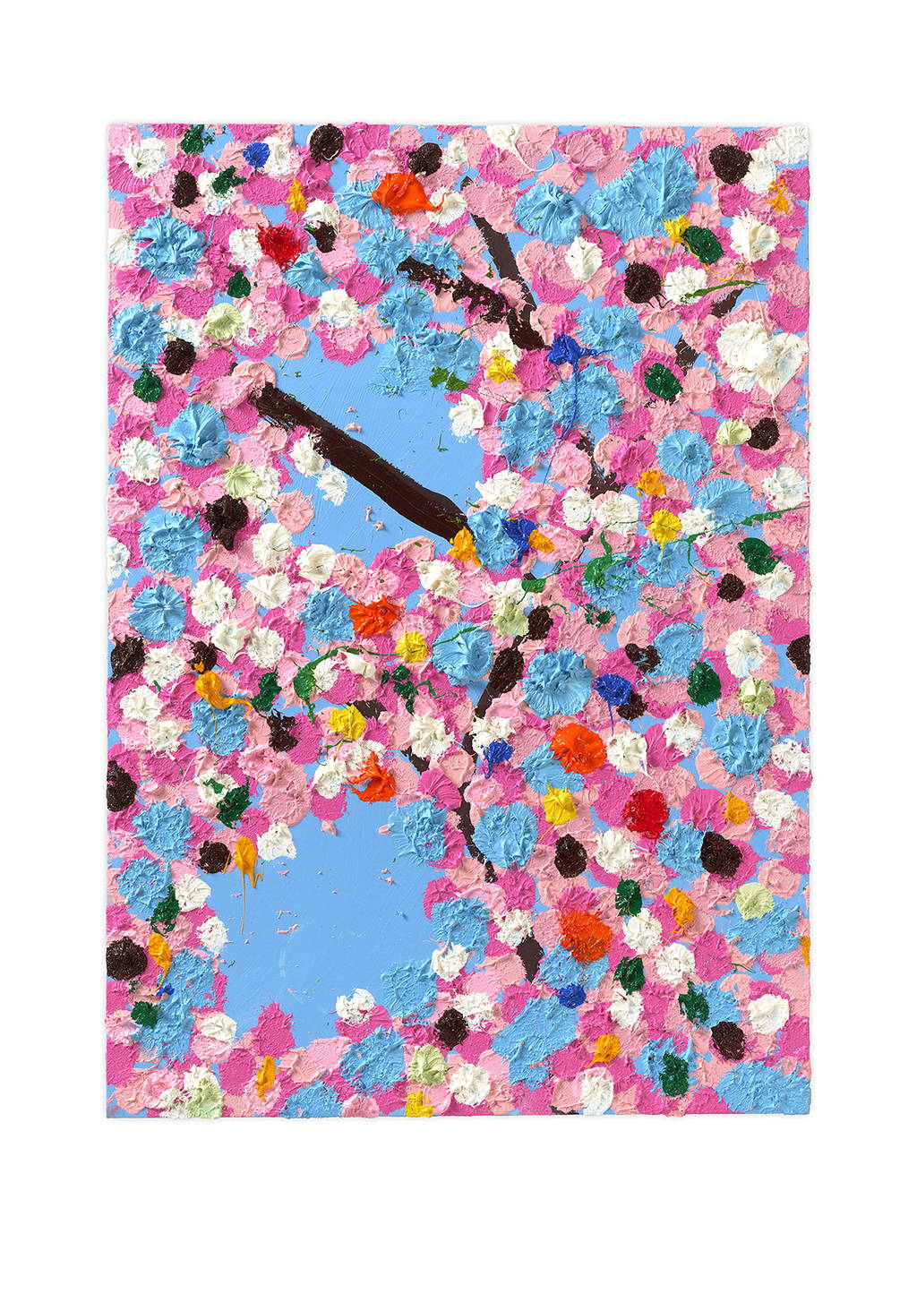 Paper Blossoms is a series of 900 unique original paintings on card featuring the vibrant imagery of Hirst's Cherry Blossoms paintings.