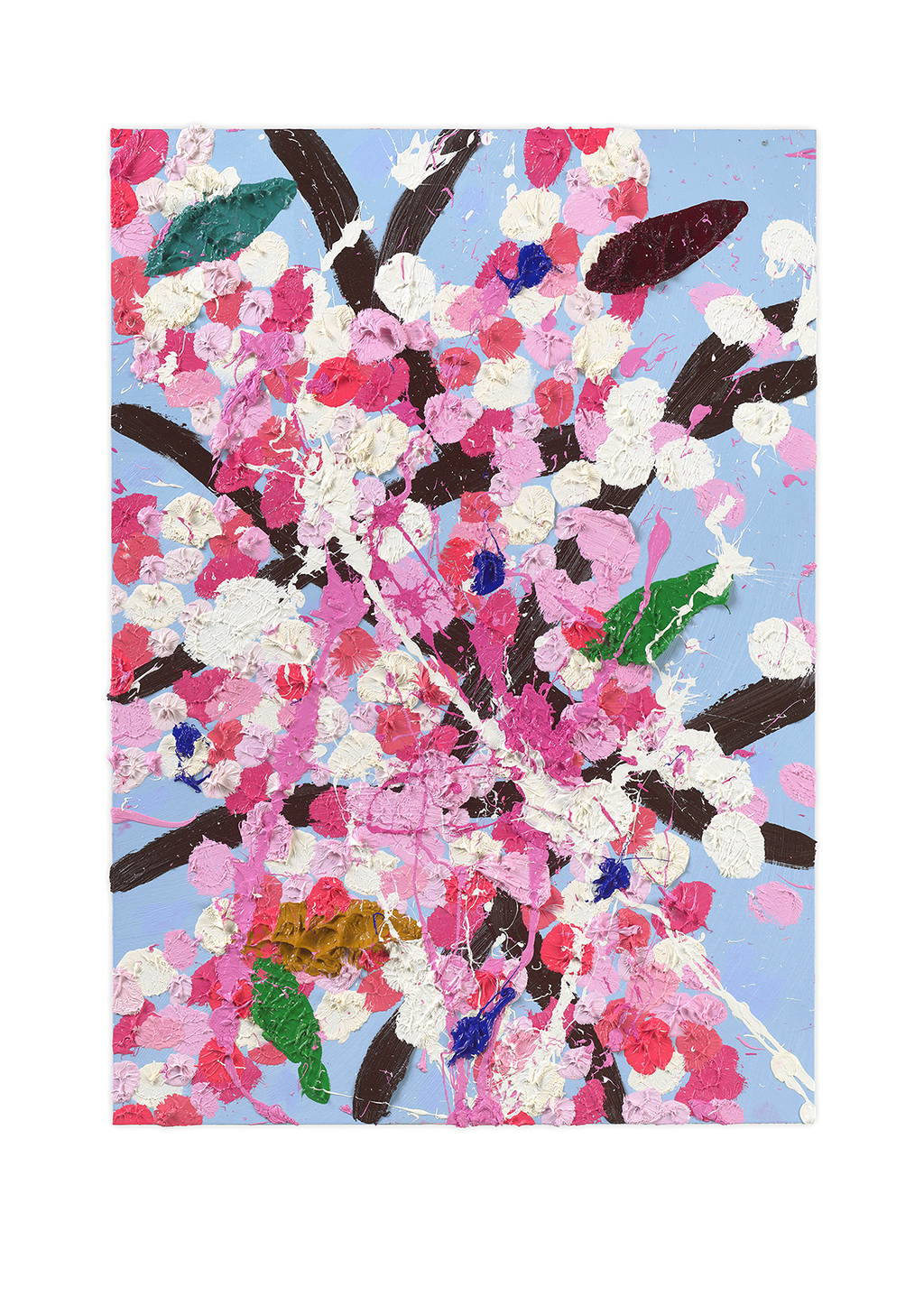 Paper Blossoms is a series of 900 unique original paintings on card featuring the vibrant imagery of Hirst's Cherry Blossoms paintings.