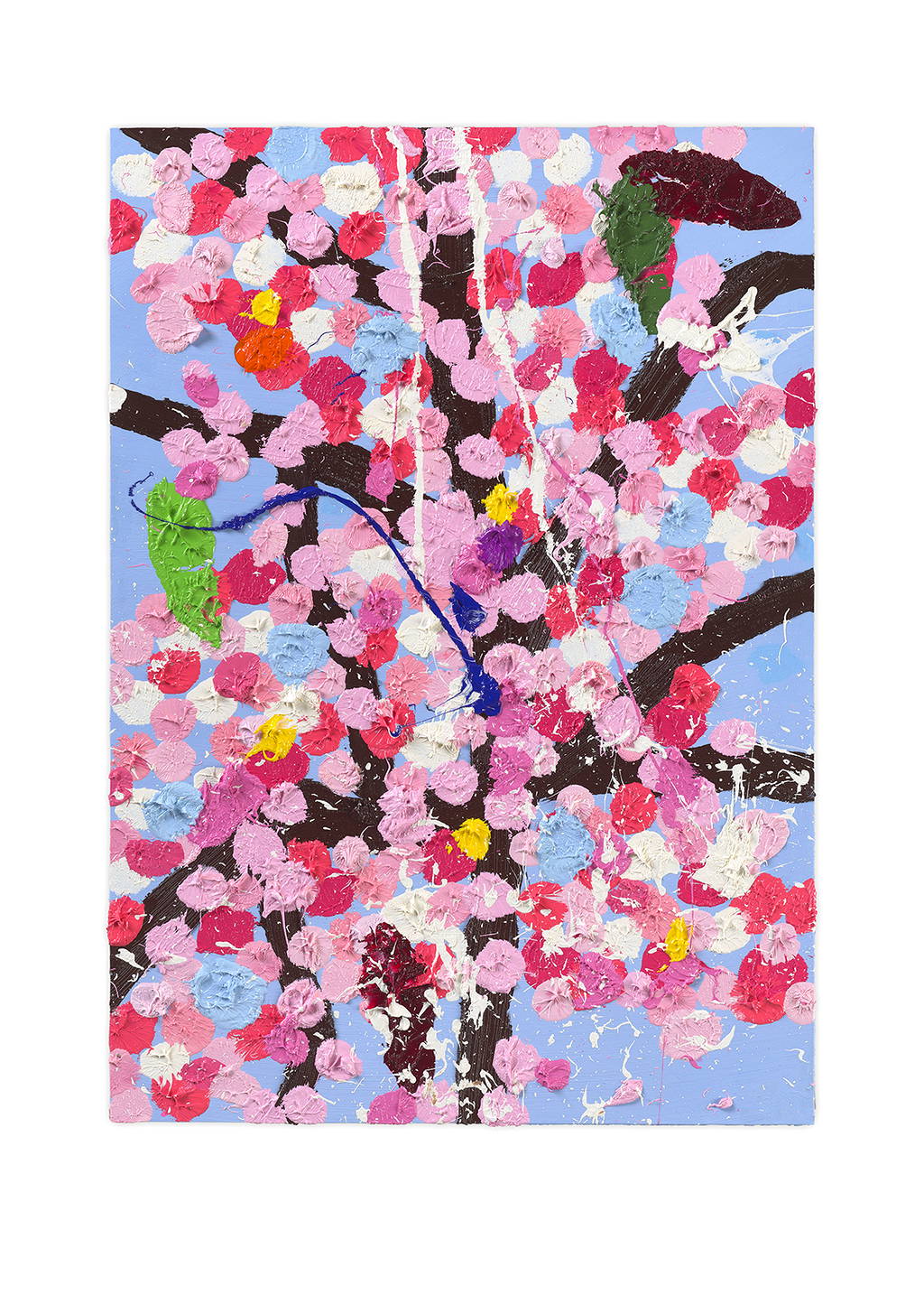 Paper Blossoms is a series of 900 unique original paintings on card featuring the vibrant imagery of Hirst's Cherry Blossoms paintings.