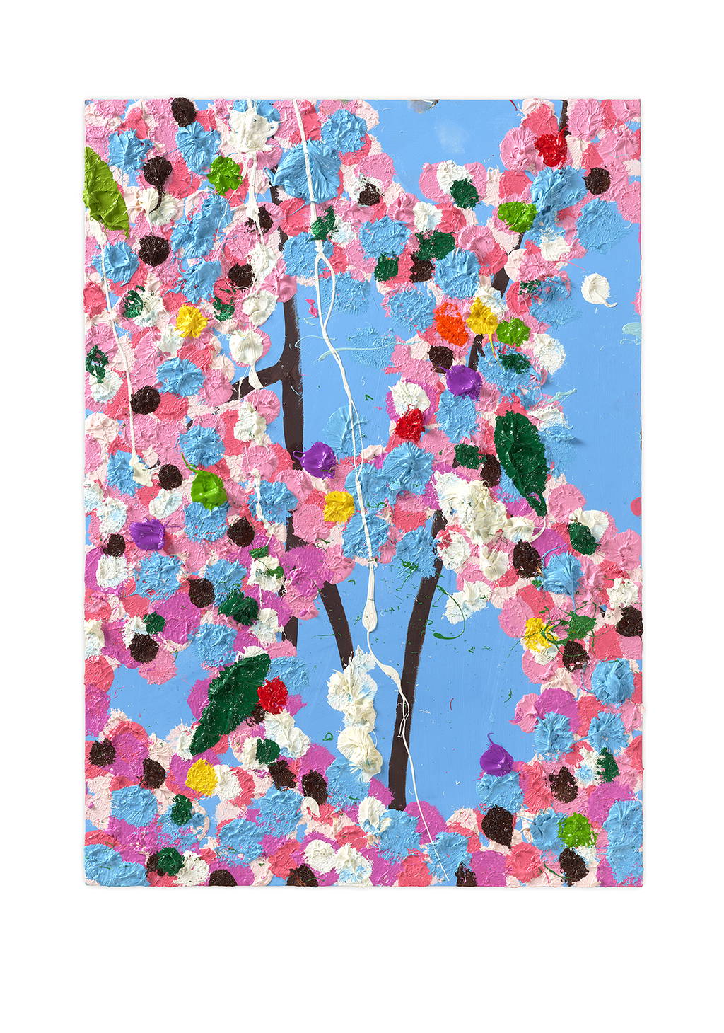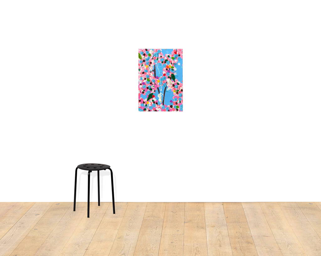 Paper Blossoms is a series of 900 unique original paintings on card featuring the vibrant imagery of Hirst's Cherry Blossoms paintings.