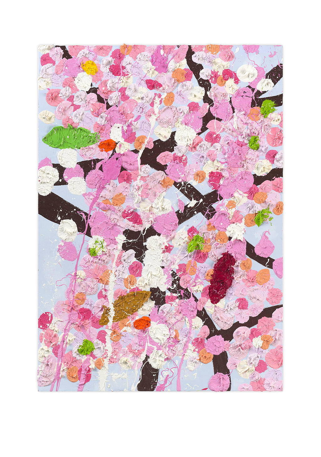 Paper Blossoms is a series of 900 unique original paintings on card featuring the vibrant imagery of Hirst's Cherry Blossoms paintings.