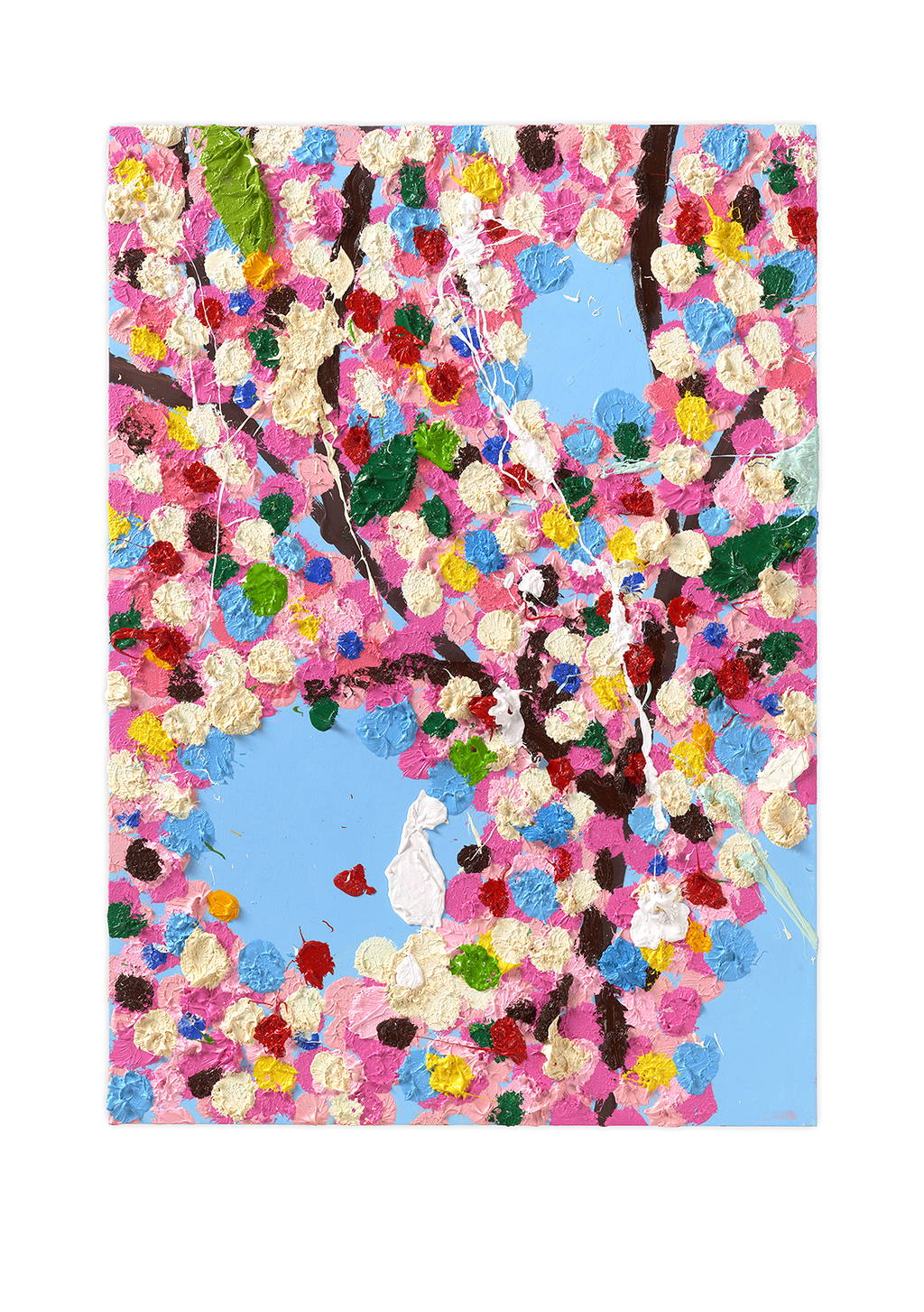 Paper Blossoms is a series of 900 unique original paintings on card featuring the vibrant imagery of Hirst's Cherry Blossoms paintings.