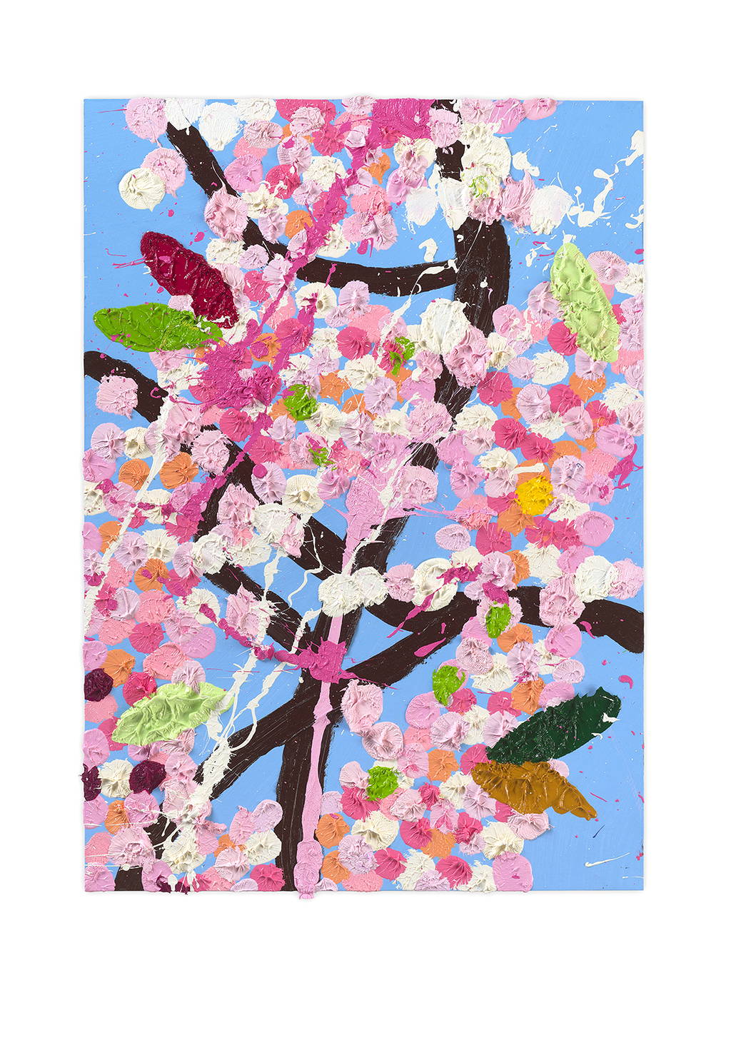 Paper Blossoms is a series of 900 unique original paintings on card featuring the vibrant imagery of Hirst's Cherry Blossoms paintings.