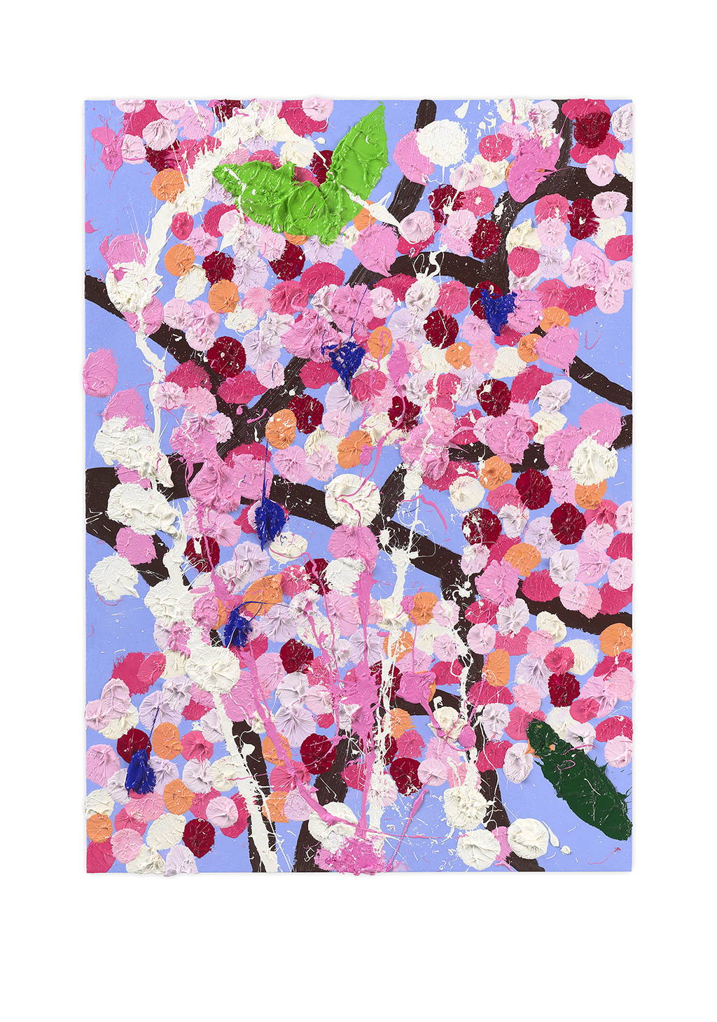 Paper Blossoms is a series of 900 unique original paintings on card featuring the vibrant imagery of Hirst's Cherry Blossoms paintings.
