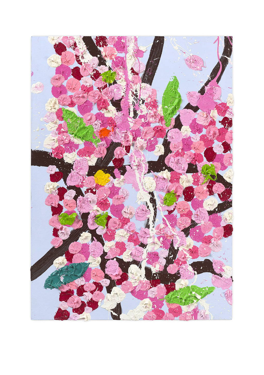 Paper Blossoms is a series of 900 unique original paintings on card featuring the vibrant imagery of Hirst's Cherry Blossoms paintings.