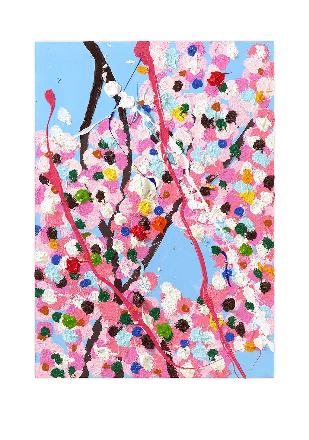 Paper Blossoms is a series of 900 unique original paintings on card featuring the vibrant imagery of Hirst's Cherry Blossoms paintings.