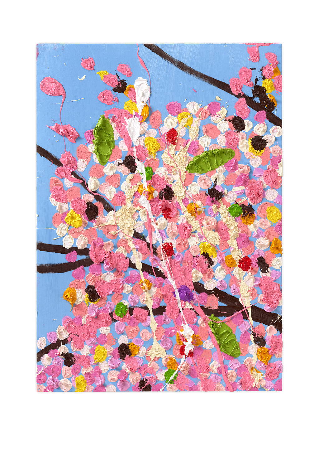 Paper Blossoms is a series of 900 unique original paintings on card featuring the vibrant imagery of Hirst's Cherry Blossoms paintings.