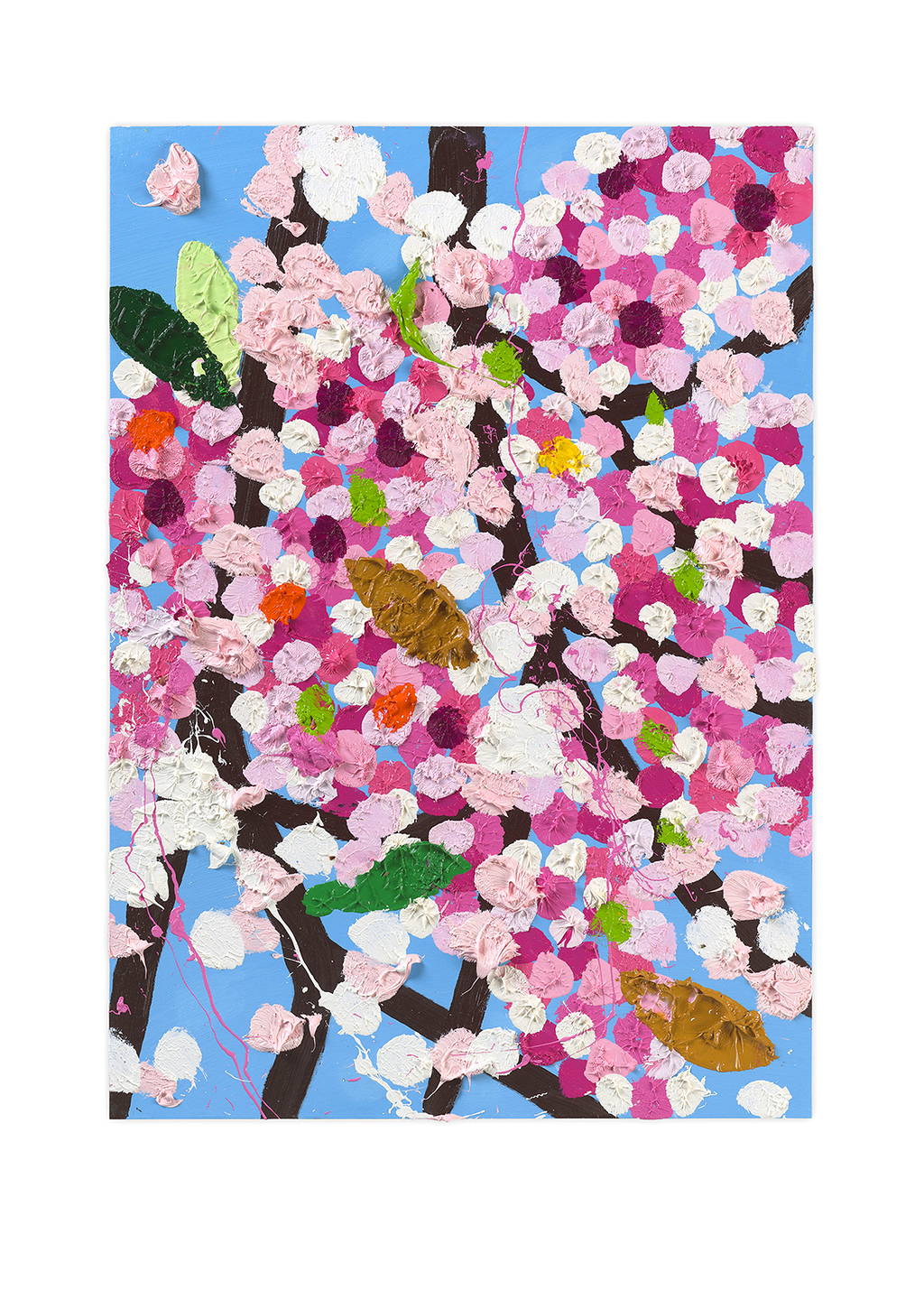 Paper Blossoms is a series of 900 unique original paintings on card featuring the vibrant imagery of Hirst's Cherry Blossoms paintings.