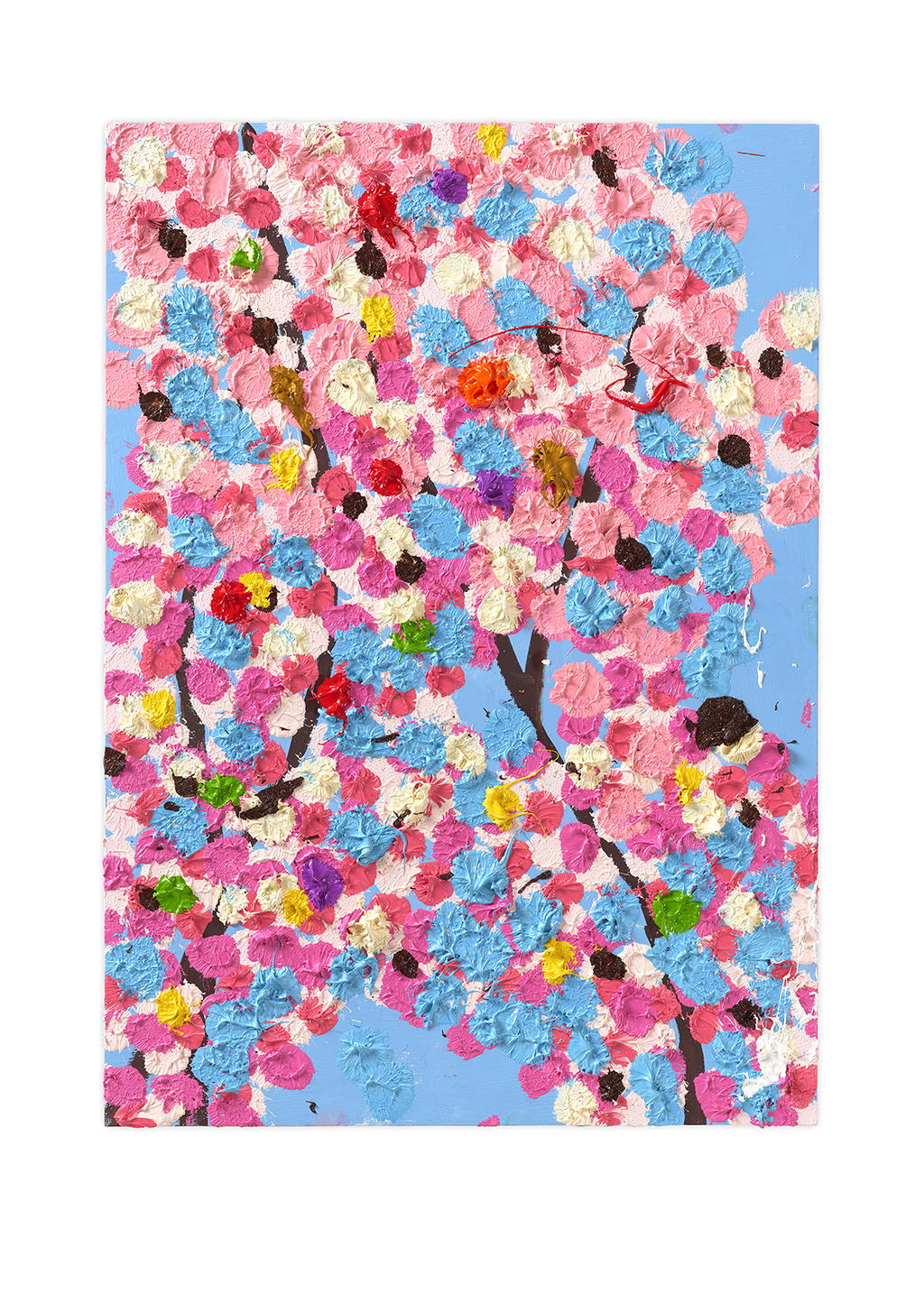 Paper Blossoms is a series of 900 unique original paintings on card featuring the vibrant imagery of Hirst's Cherry Blossoms paintings.