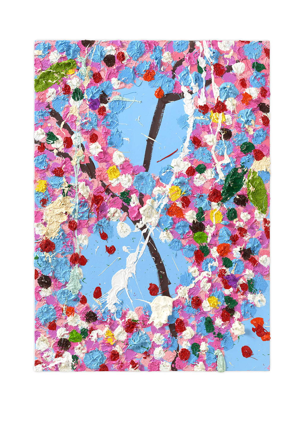 Paper Blossoms is a series of 900 unique original paintings on card featuring the vibrant imagery of Hirst's Cherry Blossoms paintings.