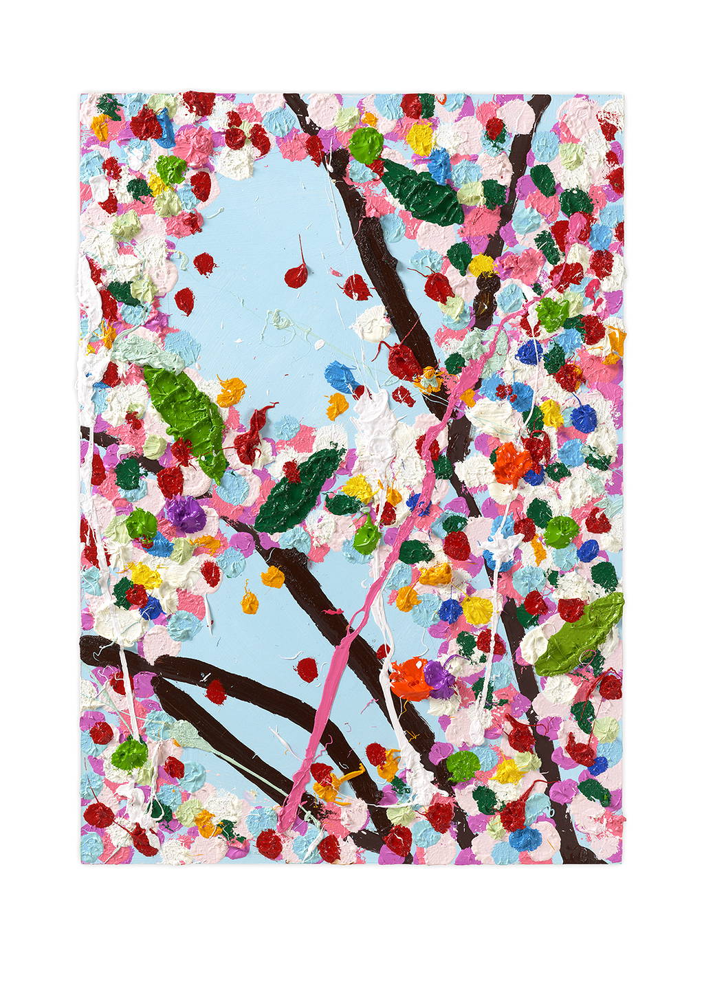 Paper Blossoms is a series of 900 unique original paintings on card featuring the vibrant imagery of Hirst's Cherry Blossoms paintings.