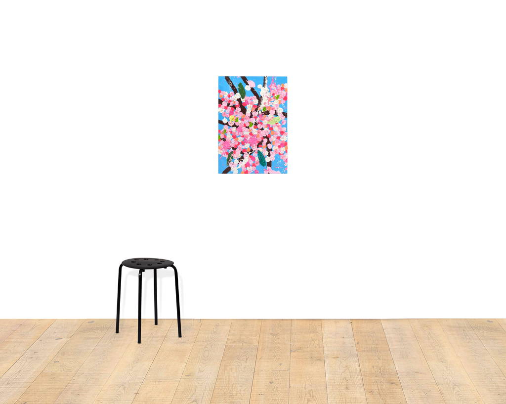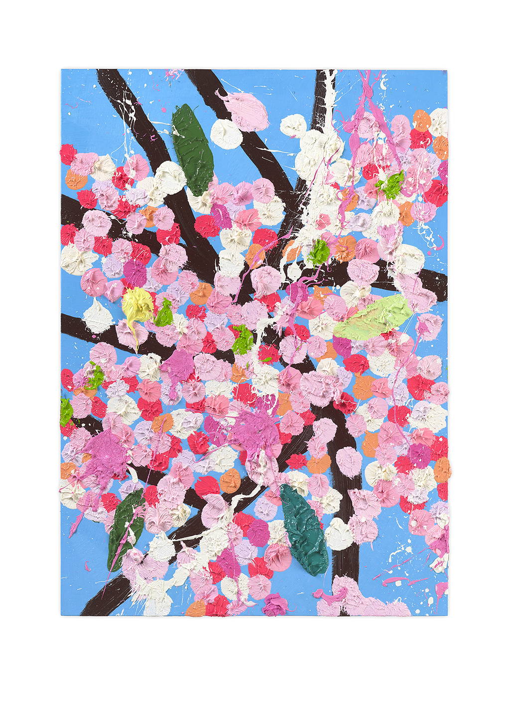 Paper Blossoms is a series of 900 unique original paintings on card featuring the vibrant imagery of Hirst's Cherry Blossoms paintings.
