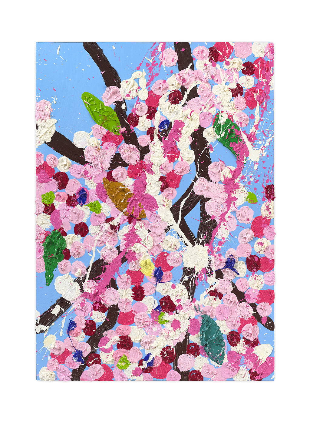 Paper Blossoms is a series of 900 unique original paintings on card featuring the vibrant imagery of Hirst's Cherry Blossoms paintings.
