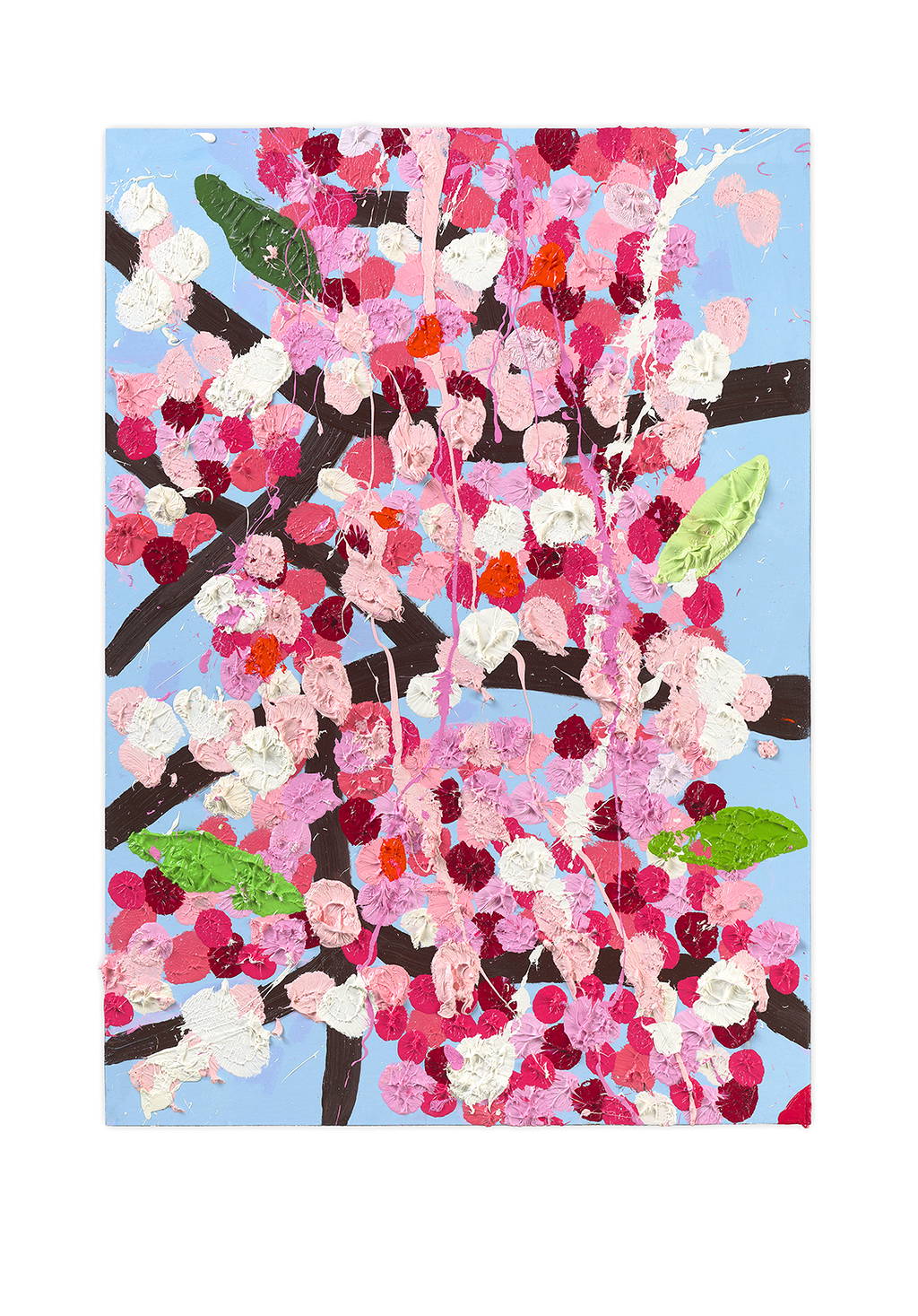 Paper Blossoms is a series of 900 unique original paintings on card featuring the vibrant imagery of Hirst's Cherry Blossoms paintings.