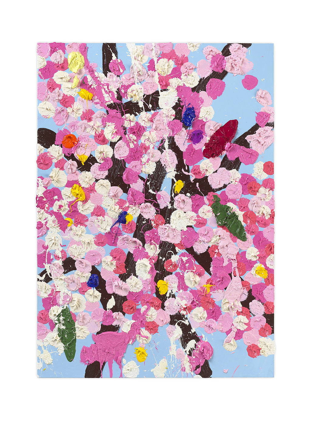 Paper Blossoms is a series of 900 unique original paintings on card featuring the vibrant imagery of Hirst's Cherry Blossoms paintings.