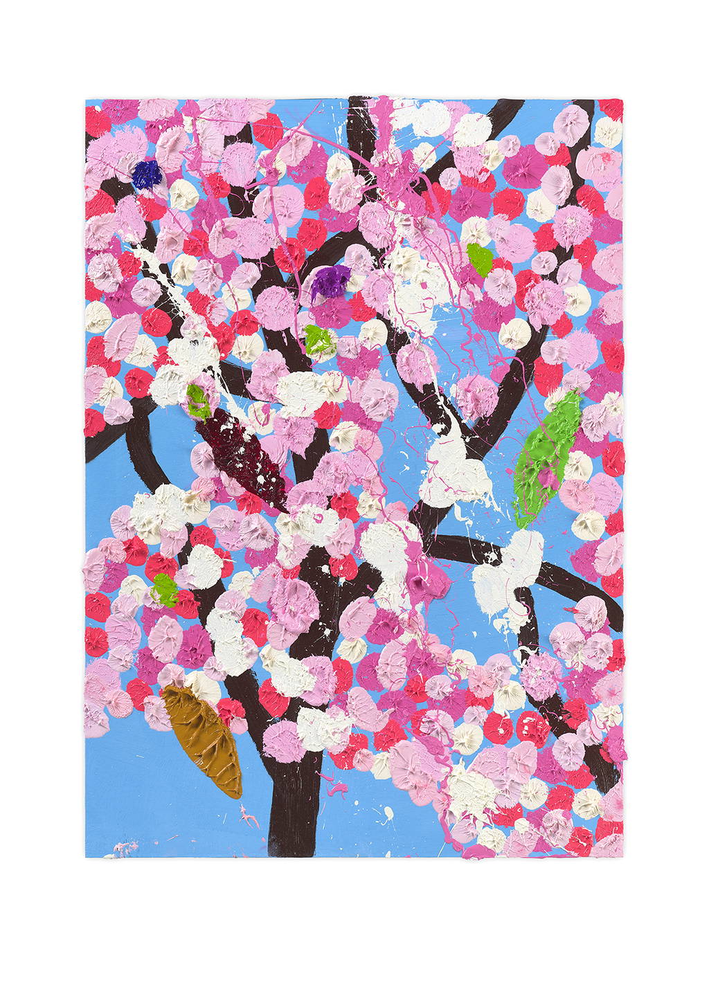 Paper Blossoms is a series of 900 unique original paintings on card featuring the vibrant imagery of Hirst's Cherry Blossoms paintings.