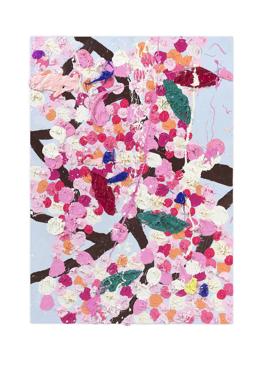 Paper Blossoms is a series of 900 unique original paintings on card featuring the vibrant imagery of Hirst's Cherry Blossoms paintings.