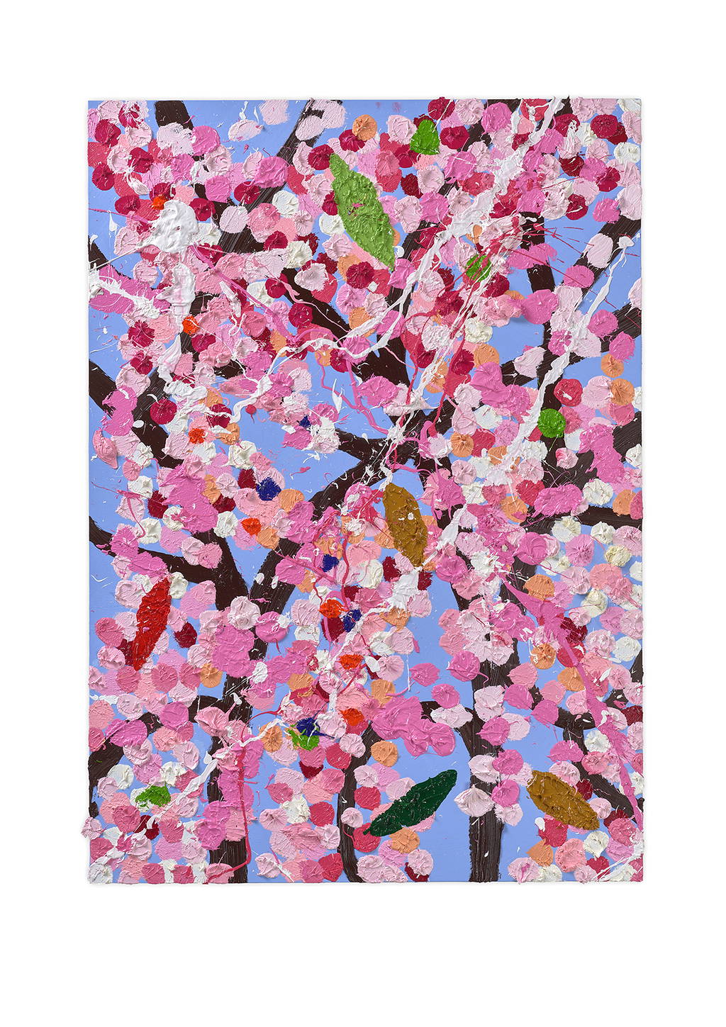 Paper Blossoms is a series of 900 unique original paintings on card featuring the vibrant imagery of Hirst's Cherry Blossoms paintings.