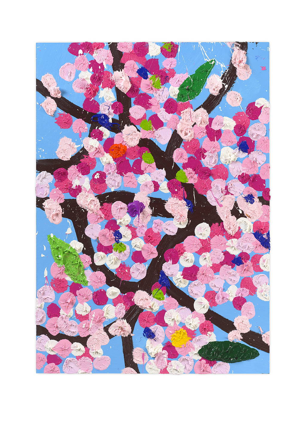 Paper Blossoms is a series of 900 unique original paintings on card featuring the vibrant imagery of Hirst's Cherry Blossoms paintings.