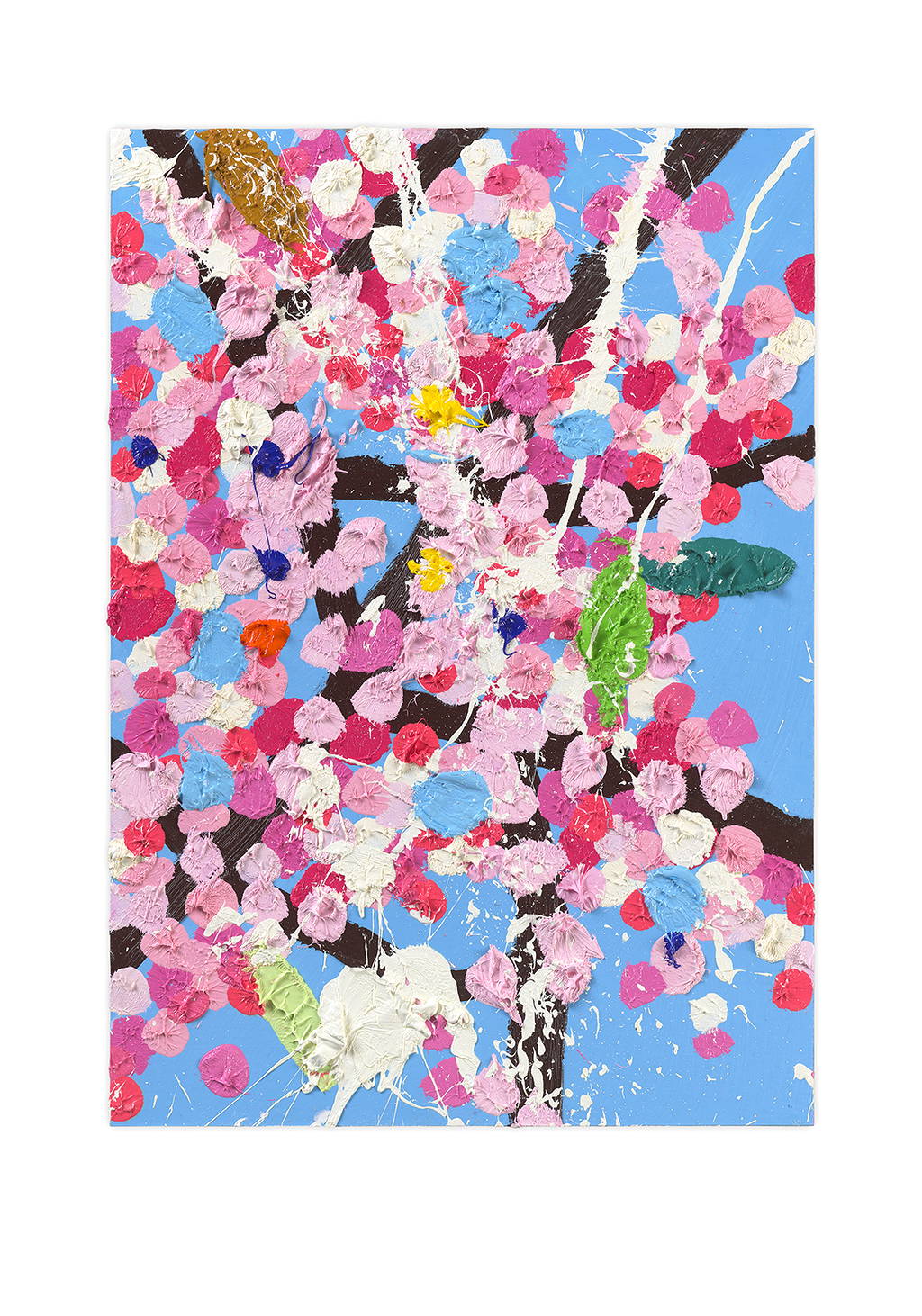 Paper Blossoms is a series of 900 unique original paintings on card featuring the vibrant imagery of Hirst's Cherry Blossoms paintings.