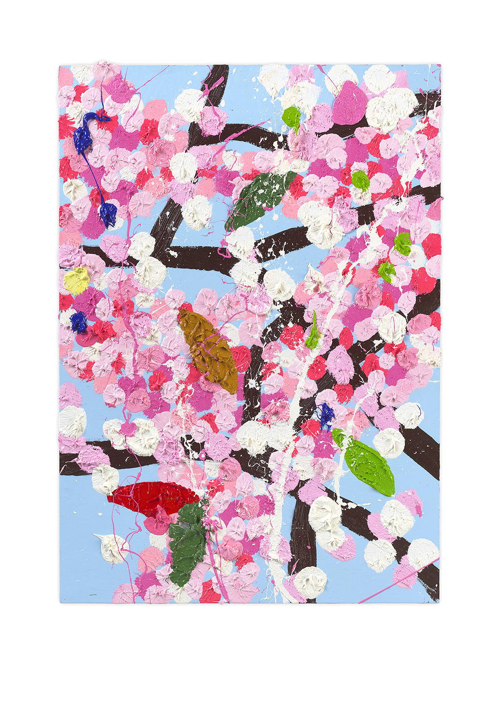Paper Blossoms is a series of 900 unique original paintings on card featuring the vibrant imagery of Hirst's Cherry Blossoms paintings.