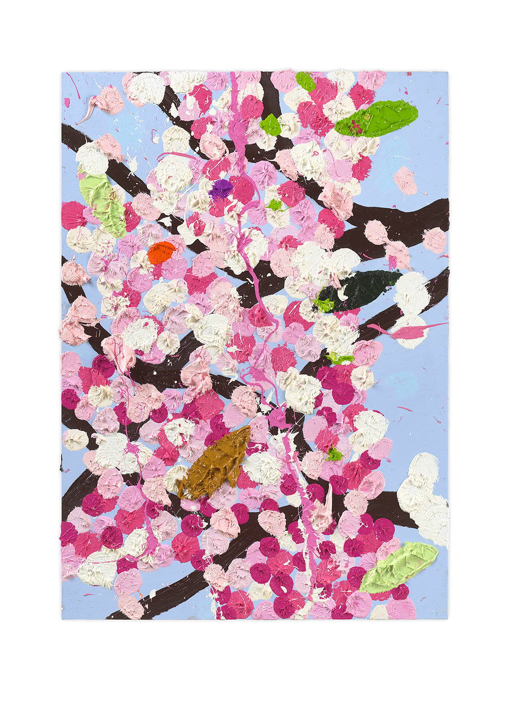 Paper Blossoms is a series of 900 unique original paintings on card featuring the vibrant imagery of Hirst's Cherry Blossoms paintings.