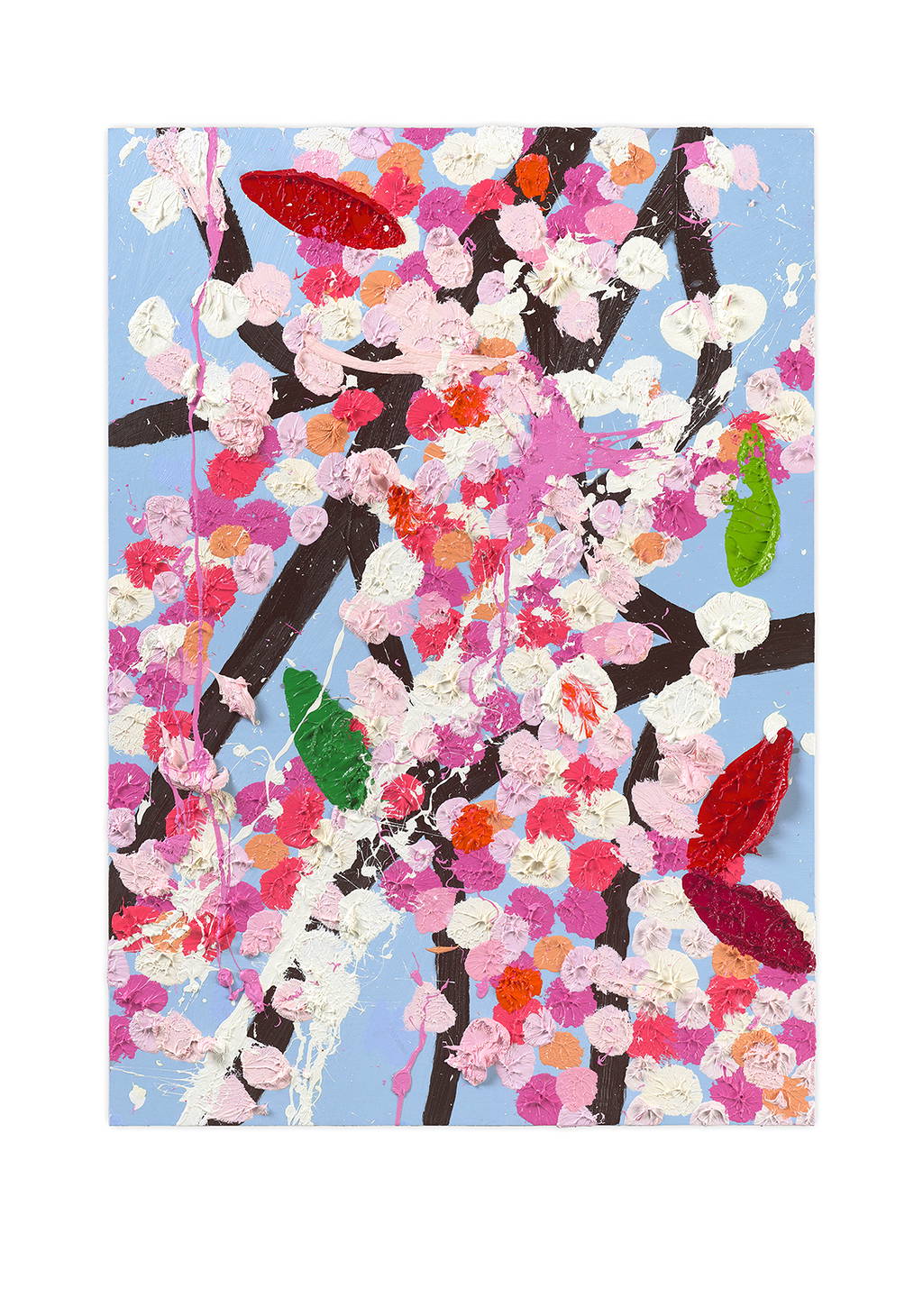 Paper Blossoms is a series of 900 unique original paintings on card featuring the vibrant imagery of Hirst's Cherry Blossoms paintings.