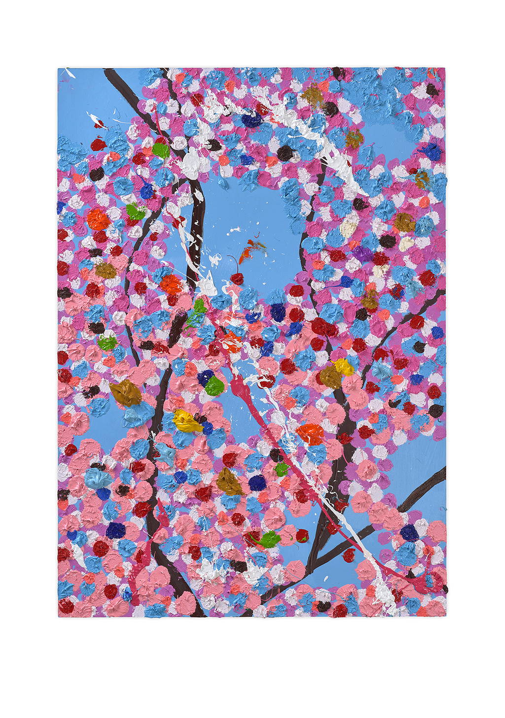 Paper Blossoms is a series of 900 unique original paintings on card featuring the vibrant imagery of Hirst's Cherry Blossoms paintings.
