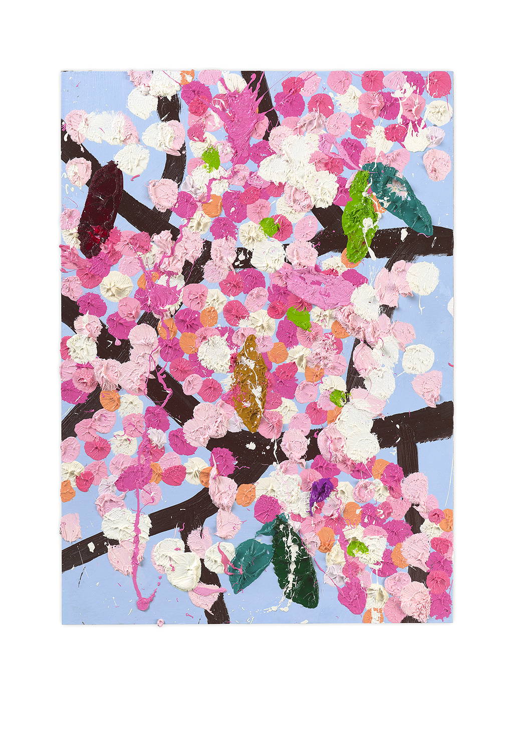 Paper Blossoms is a series of 900 unique original paintings on card featuring the vibrant imagery of Hirst's Cherry Blossoms paintings.