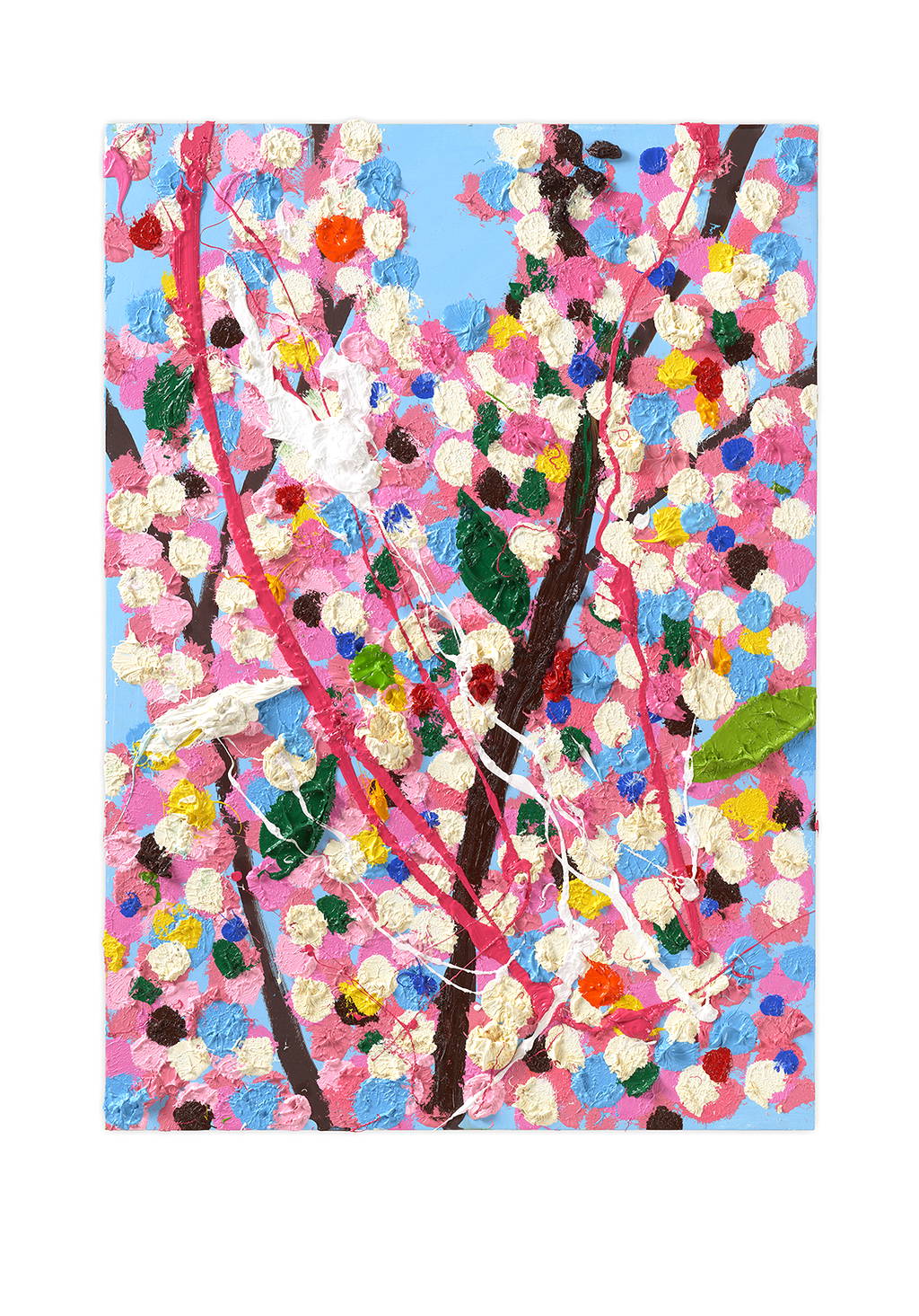 Paper Blossoms is a series of 900 unique original paintings on card featuring the vibrant imagery of Hirst's Cherry Blossoms paintings.