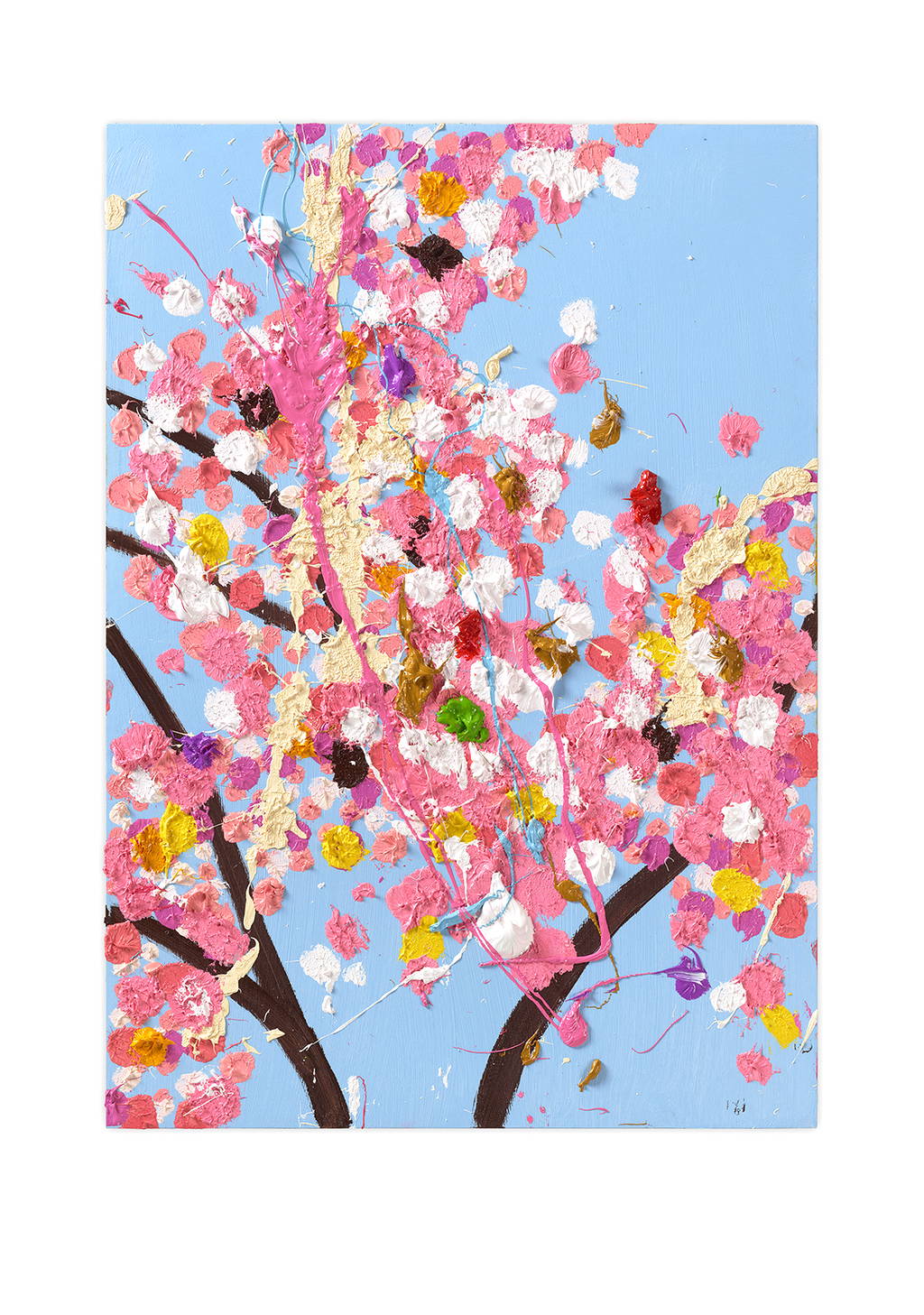Paper Blossoms is a series of 900 unique original paintings on card featuring the vibrant imagery of Hirst's Cherry Blossoms paintings.
