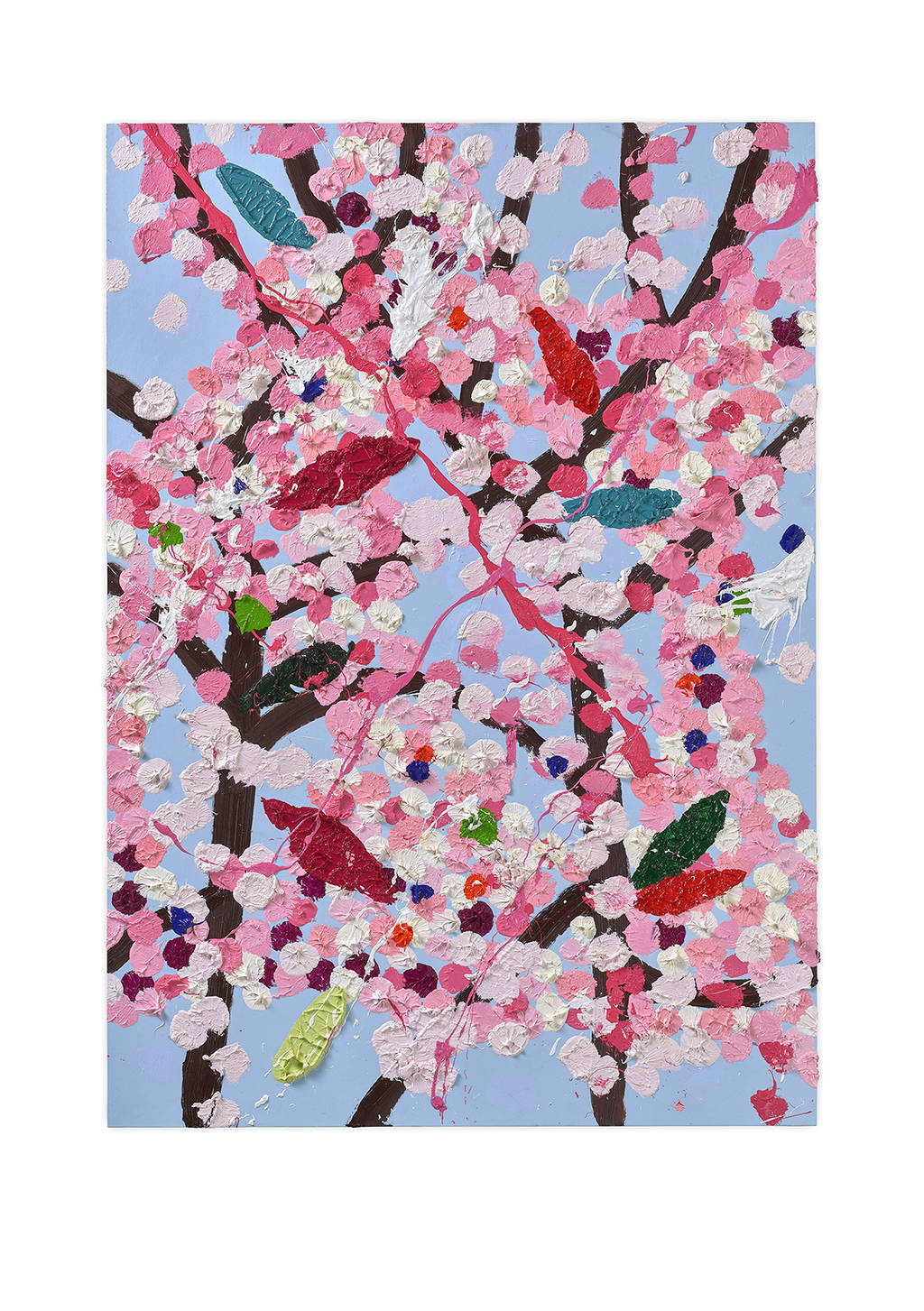 Paper Blossoms is a series of 900 unique original paintings on card featuring the vibrant imagery of Hirst's Cherry Blossoms paintings.