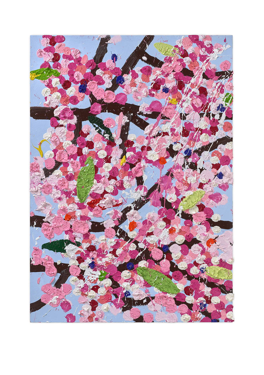 Paper Blossoms is a series of 900 unique original paintings on card featuring the vibrant imagery of Hirst's Cherry Blossoms paintings.