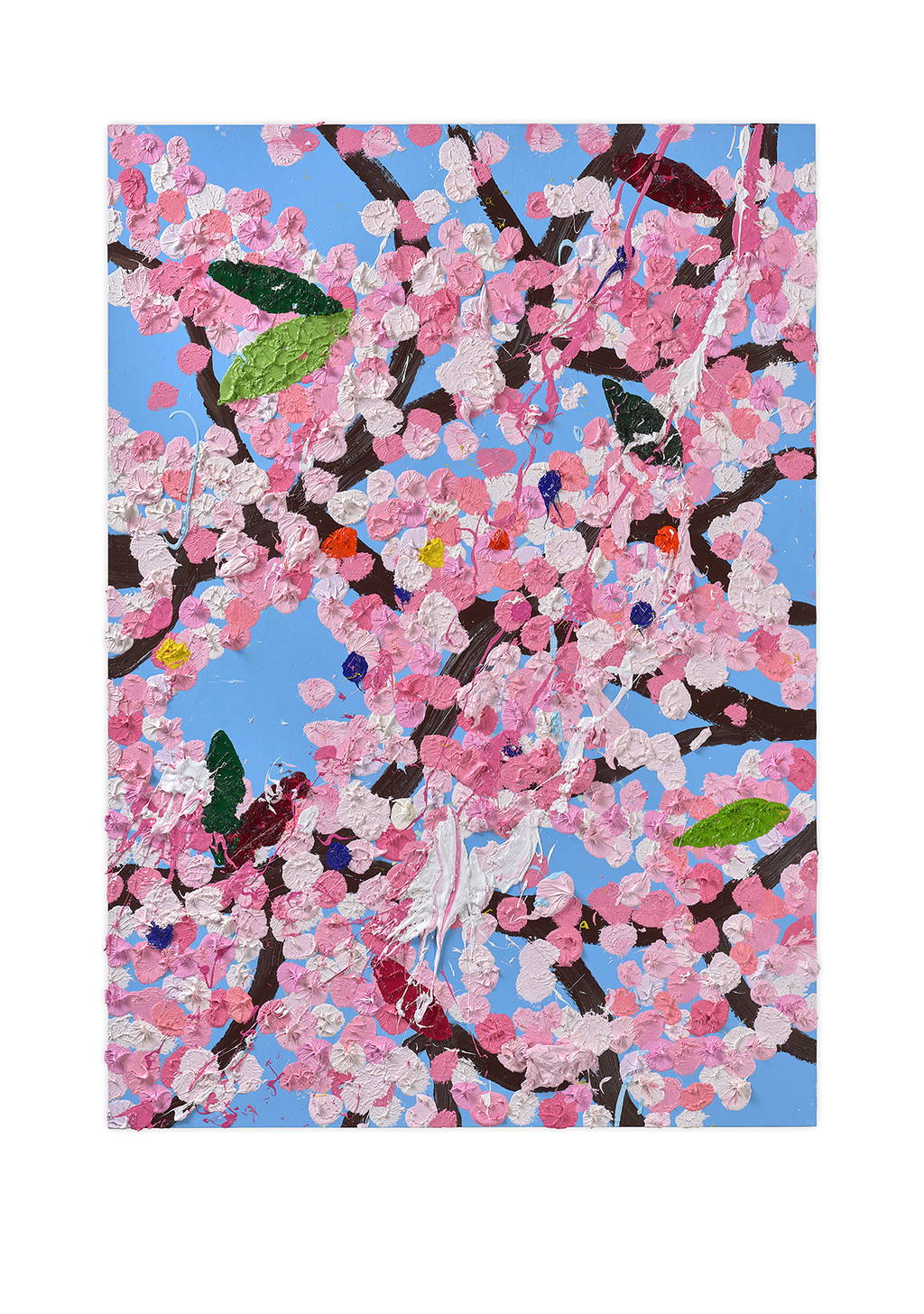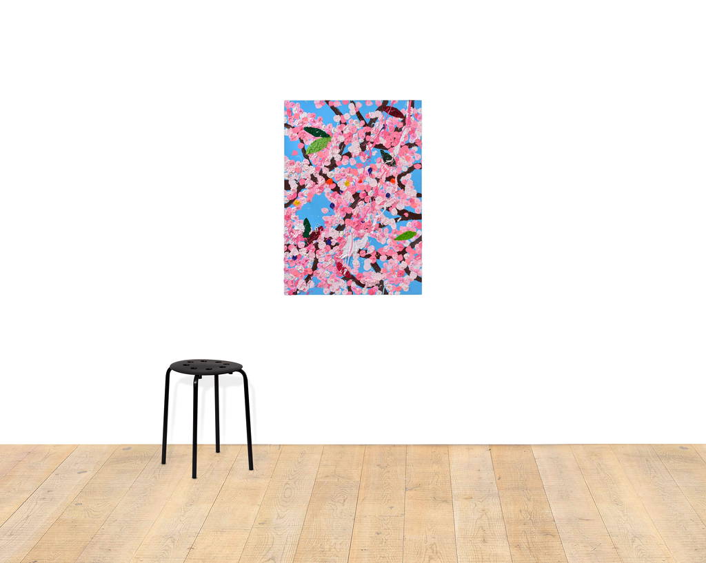 Paper Blossoms is a series of 900 unique original paintings on card featuring the vibrant imagery of Hirst's Cherry Blossoms paintings.