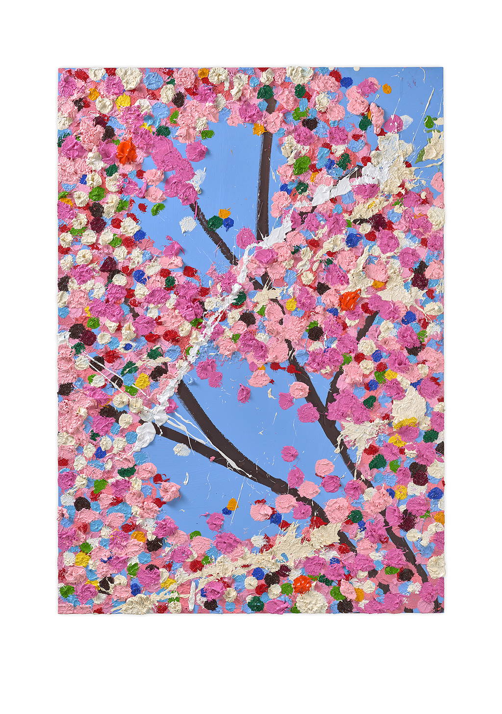 Paper Blossoms is a series of 900 unique original paintings on card featuring the vibrant imagery of Hirst's Cherry Blossoms paintings.