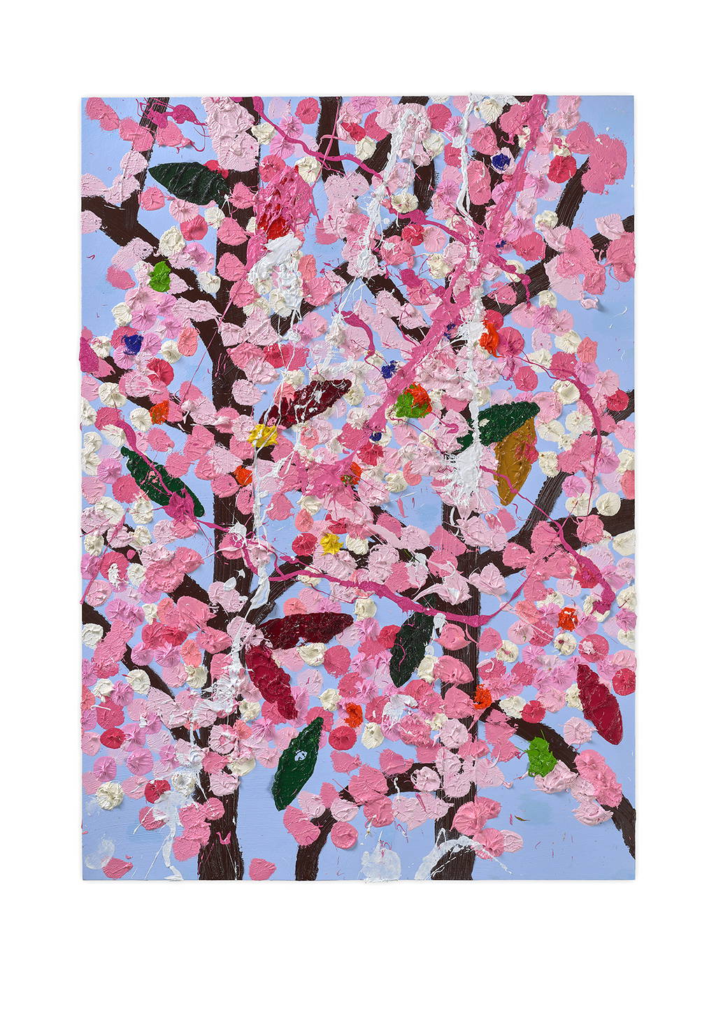 Paper Blossoms is a series of 900 unique original paintings on card featuring the vibrant imagery of Hirst's Cherry Blossoms paintings.