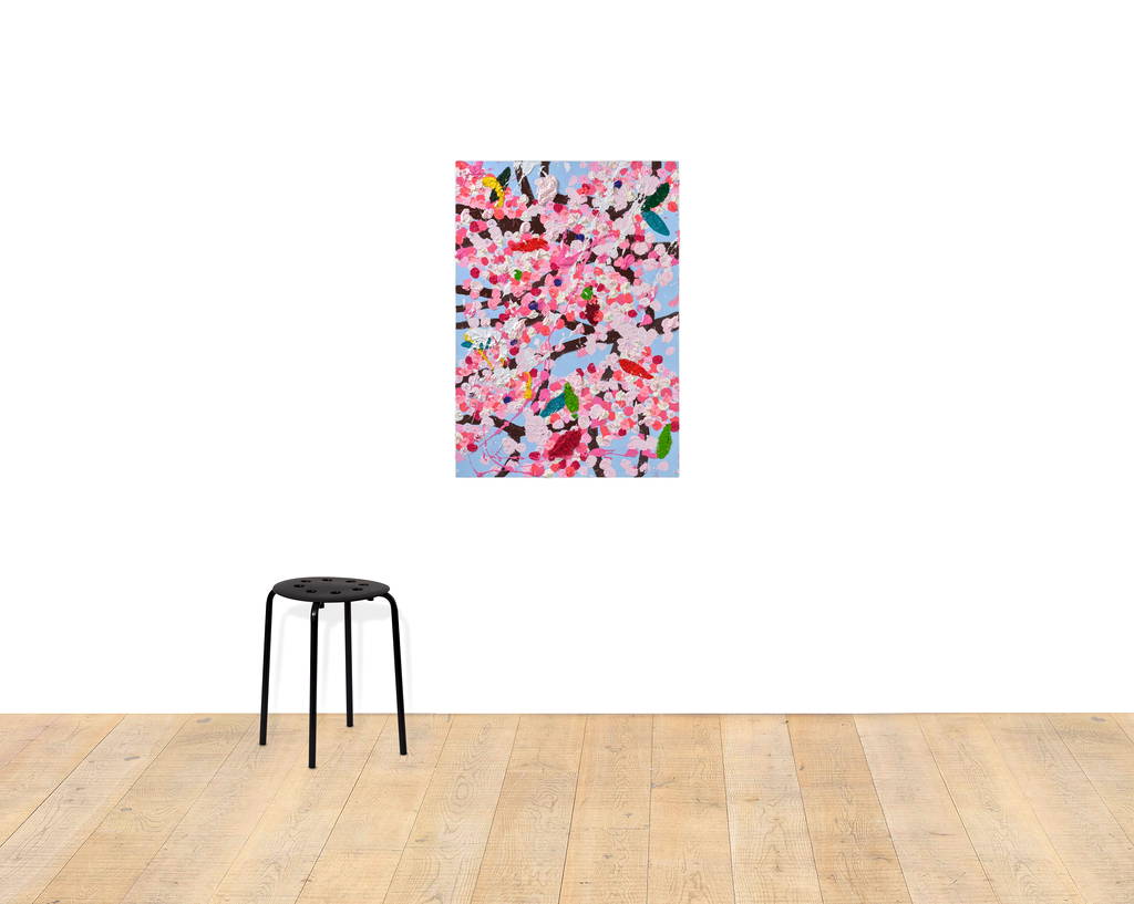 Paper Blossoms is a series of 900 unique original paintings on card featuring the vibrant imagery of Hirst's Cherry Blossoms paintings.