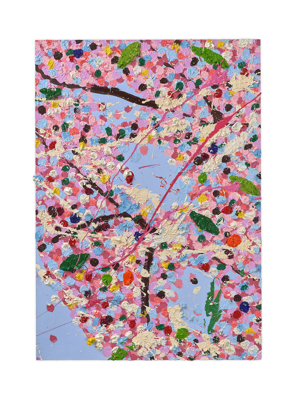 Paper Blossoms is a series of 900 unique original paintings on card featuring the vibrant imagery of Hirst's Cherry Blossoms paintings.