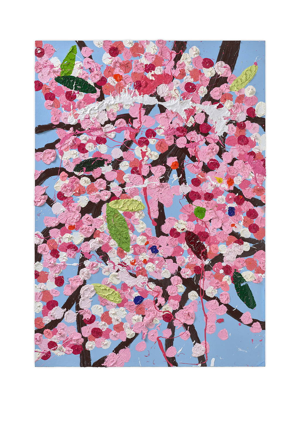 Paper Blossoms is a series of 900 unique original paintings on card featuring the vibrant imagery of Hirst's Cherry Blossoms paintings.