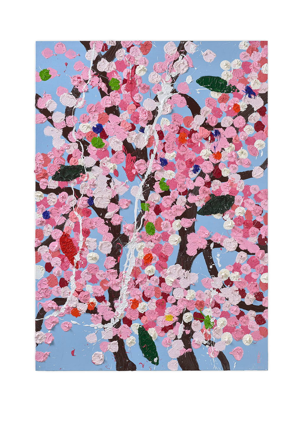 Paper Blossoms is a series of 900 unique original paintings on card featuring the vibrant imagery of Hirst's Cherry Blossoms paintings.