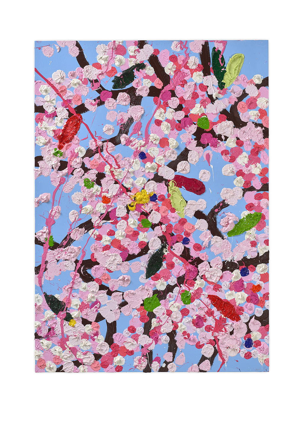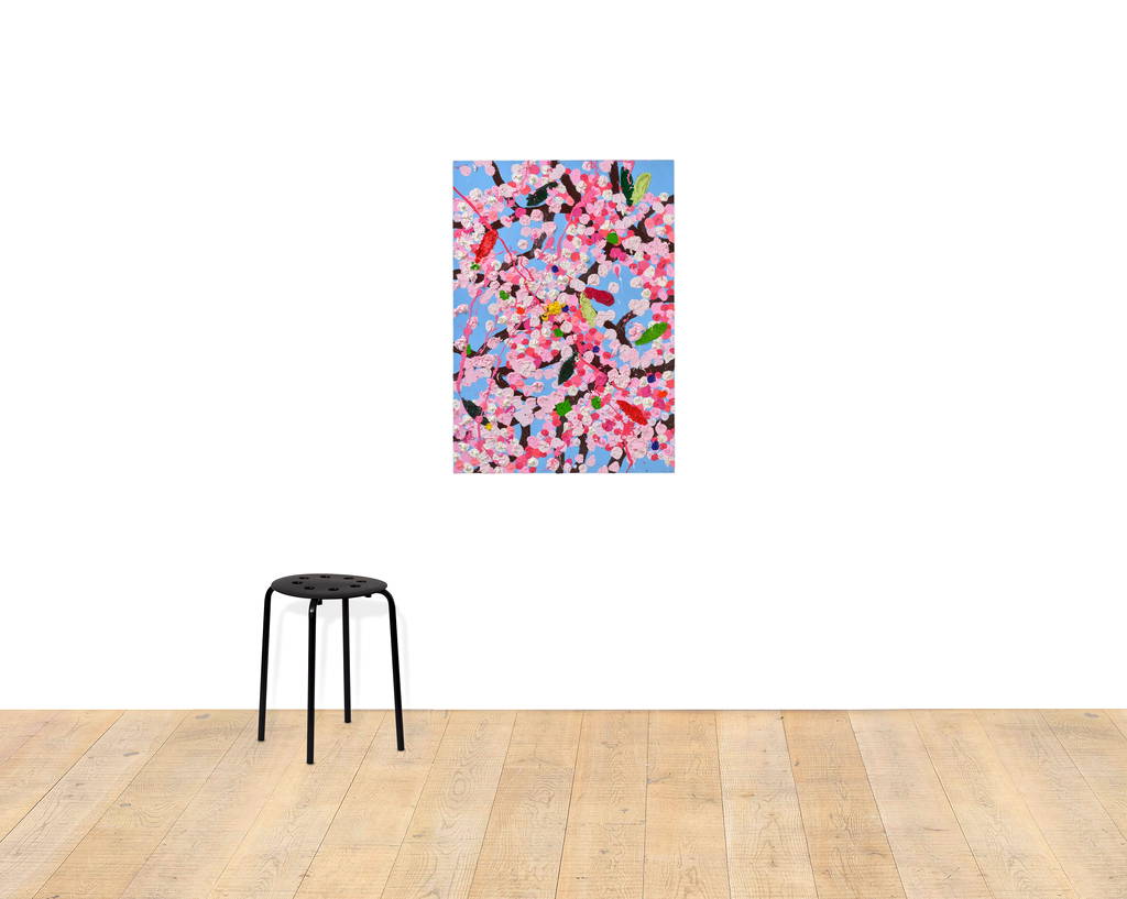 Paper Blossoms is a series of 900 unique original paintings on card featuring the vibrant imagery of Hirst's Cherry Blossoms paintings.
