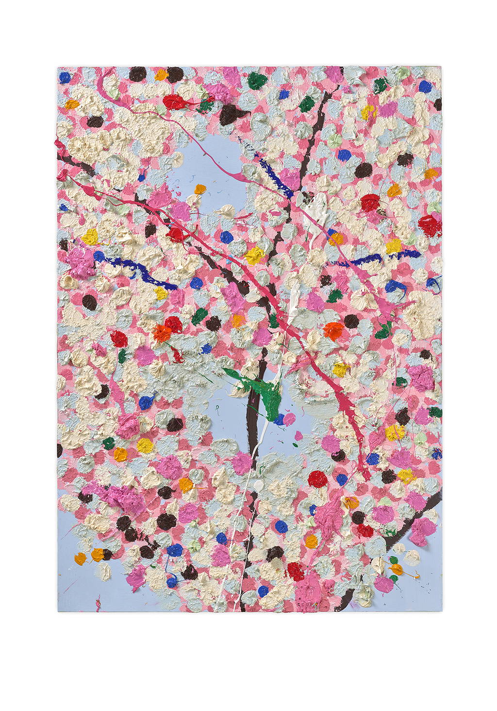 Paper Blossoms is a series of 900 unique original paintings on card featuring the vibrant imagery of Hirst's Cherry Blossoms paintings.
