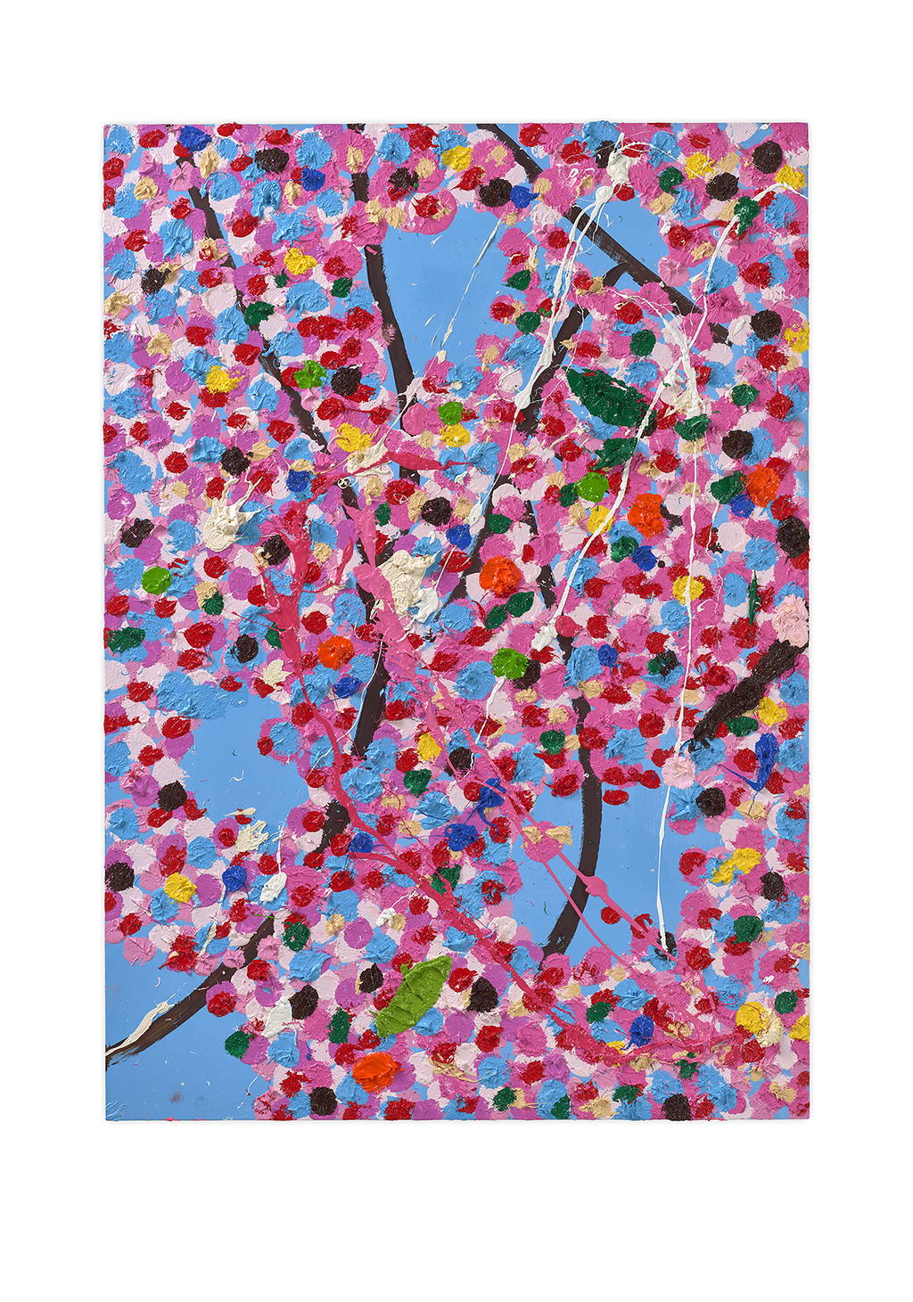 Paper Blossoms is a series of 900 unique original paintings on card featuring the vibrant imagery of Hirst's Cherry Blossoms paintings.