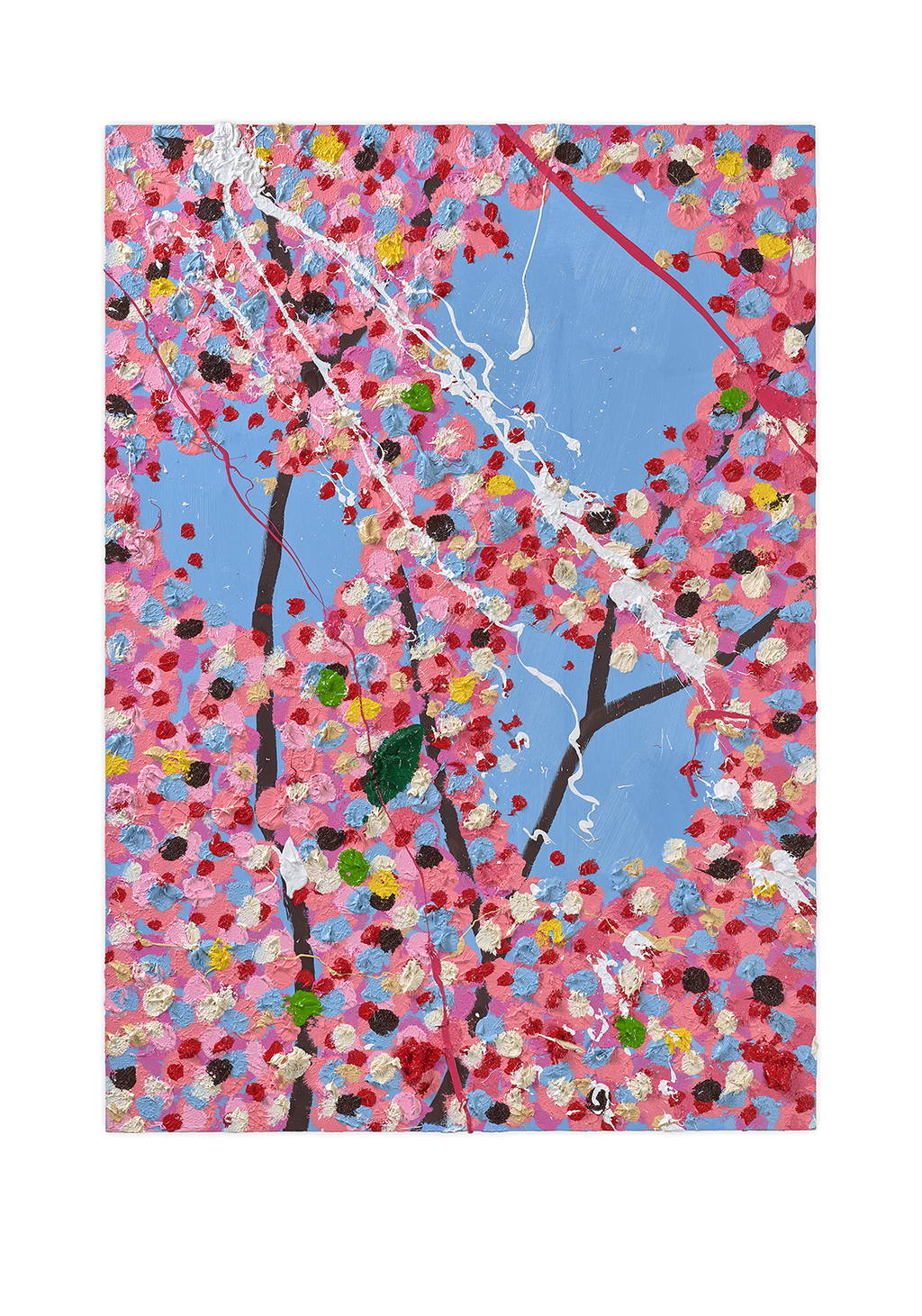 Paper Blossoms is a series of 900 unique original paintings on card featuring the vibrant imagery of Hirst's Cherry Blossoms paintings.