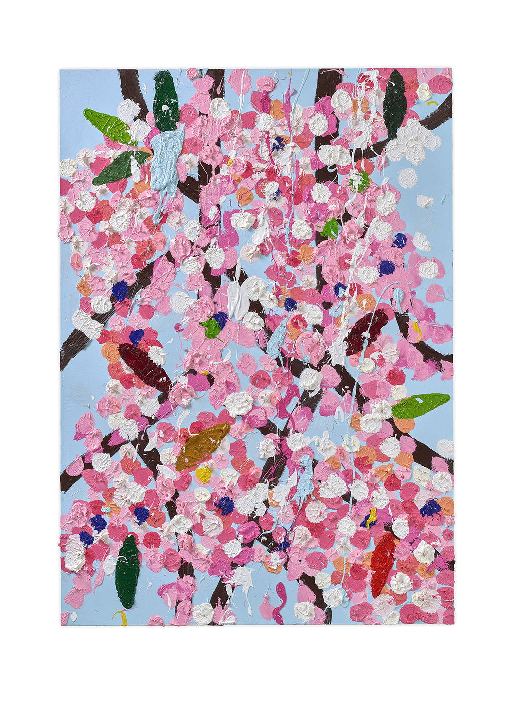Paper Blossoms is a series of 900 unique original paintings on card featuring the vibrant imagery of Hirst's Cherry Blossoms paintings.