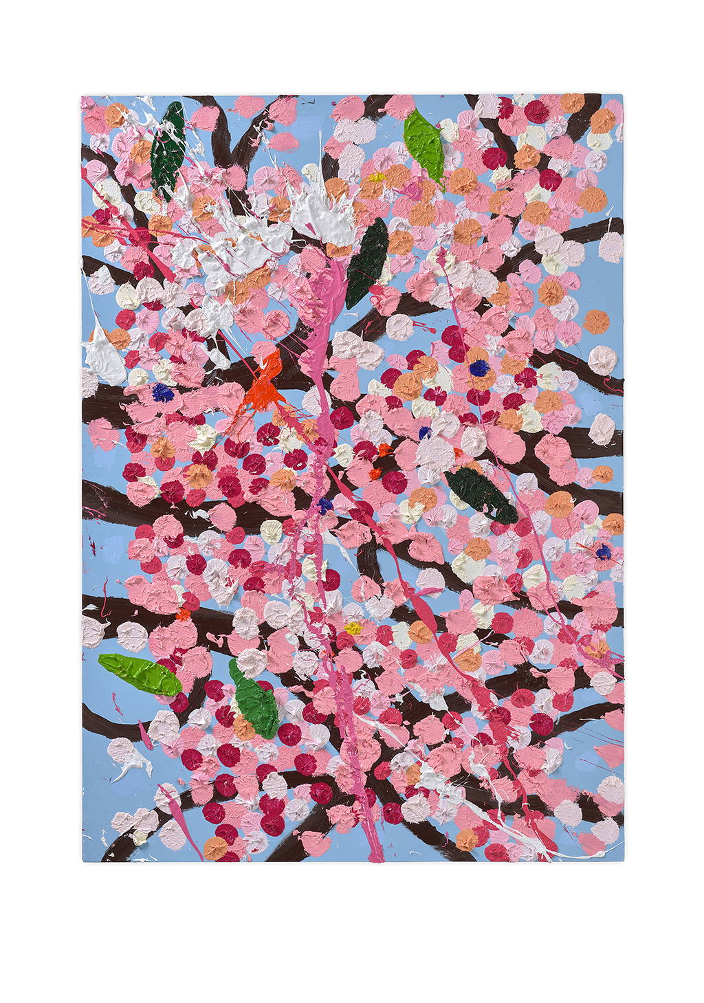 Paper Blossoms is a series of 900 unique original paintings on card featuring the vibrant imagery of Hirst's Cherry Blossoms paintings.