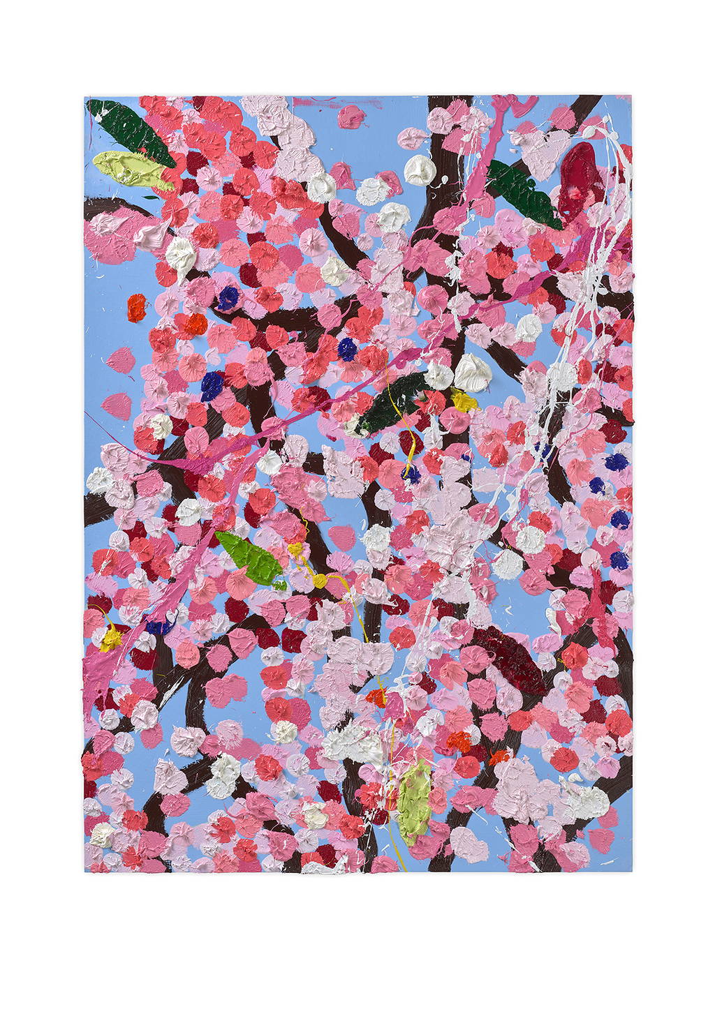Paper Blossoms is a series of 900 unique original paintings on card featuring the vibrant imagery of Hirst's Cherry Blossoms paintings.