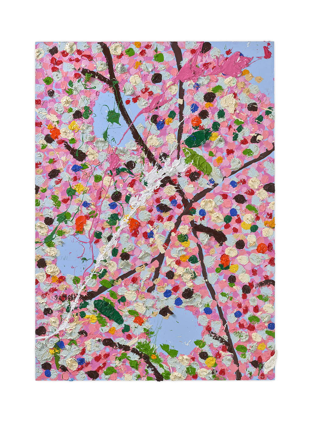 Paper Blossoms is a series of 900 unique original paintings on card featuring the vibrant imagery of Hirst's Cherry Blossoms paintings.